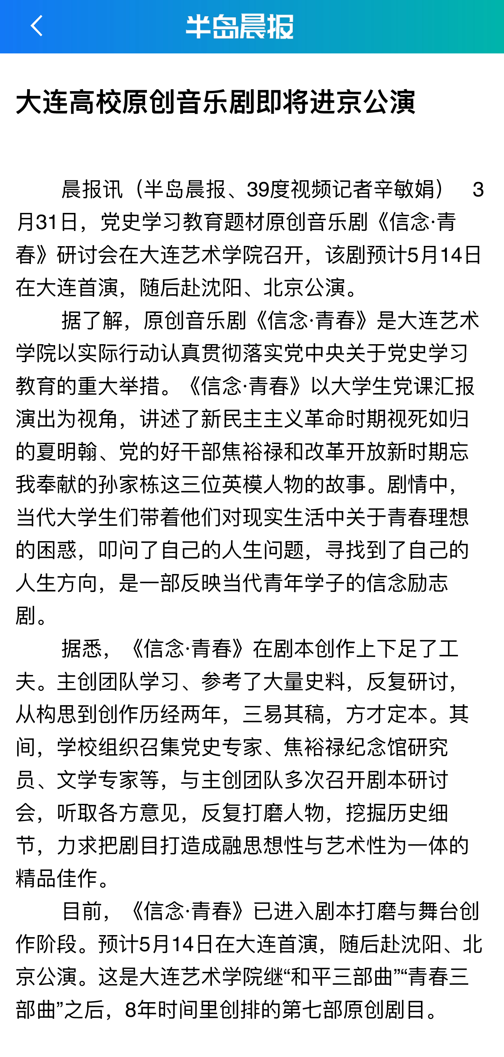 【半岛晨报】大连高校原创音乐剧即将进京公演